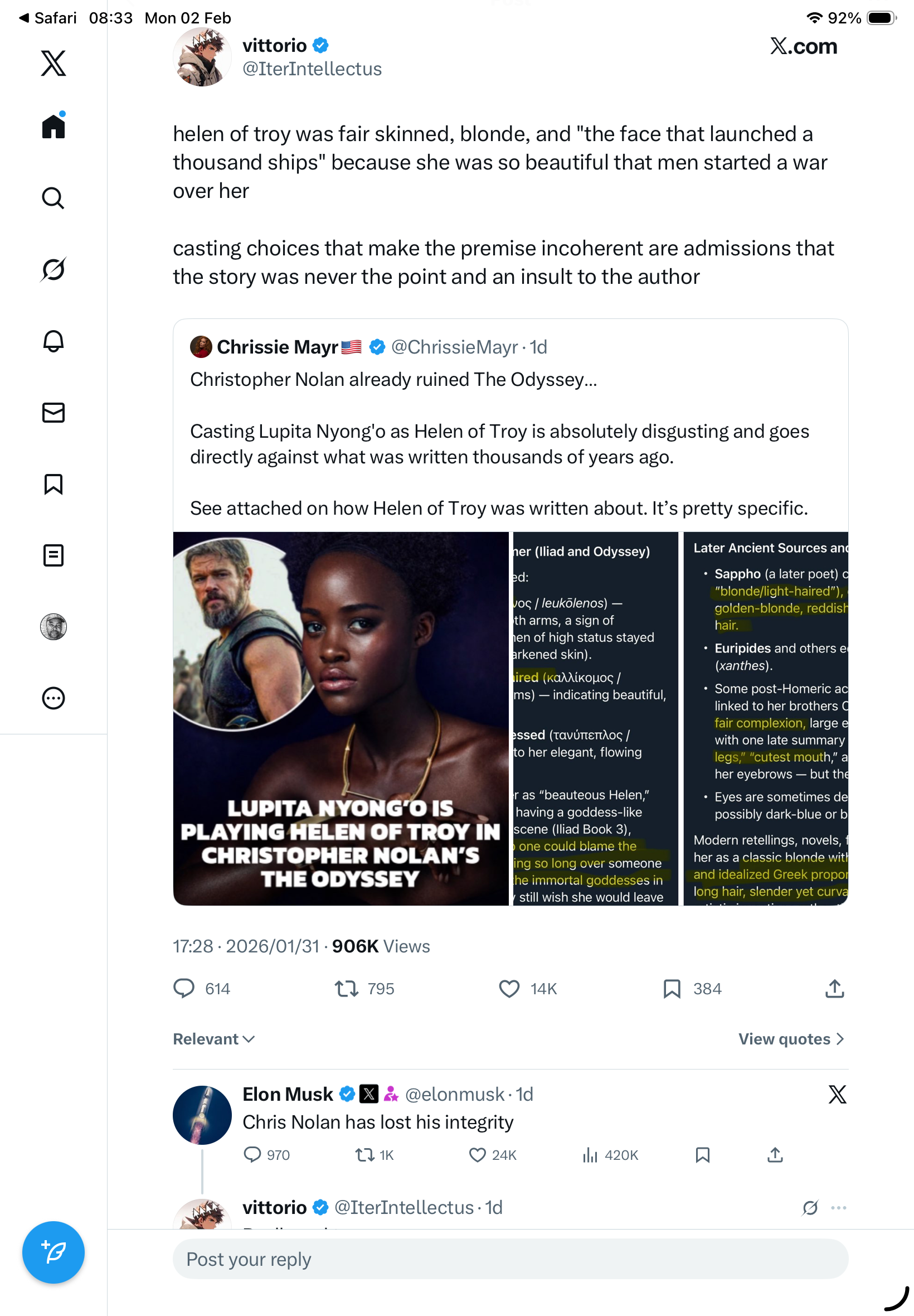 Ultimately, I am sure the film will not be asking the audience to see Helen differently because she is Black, but to see her clearly for the first time as a human being trapped inside a myth that demands a scapegoat. What other people, if not black people, carry such a burden in our age. I hope, in a way, this would be the tragedy the movie The Odyssey will partly be staging.